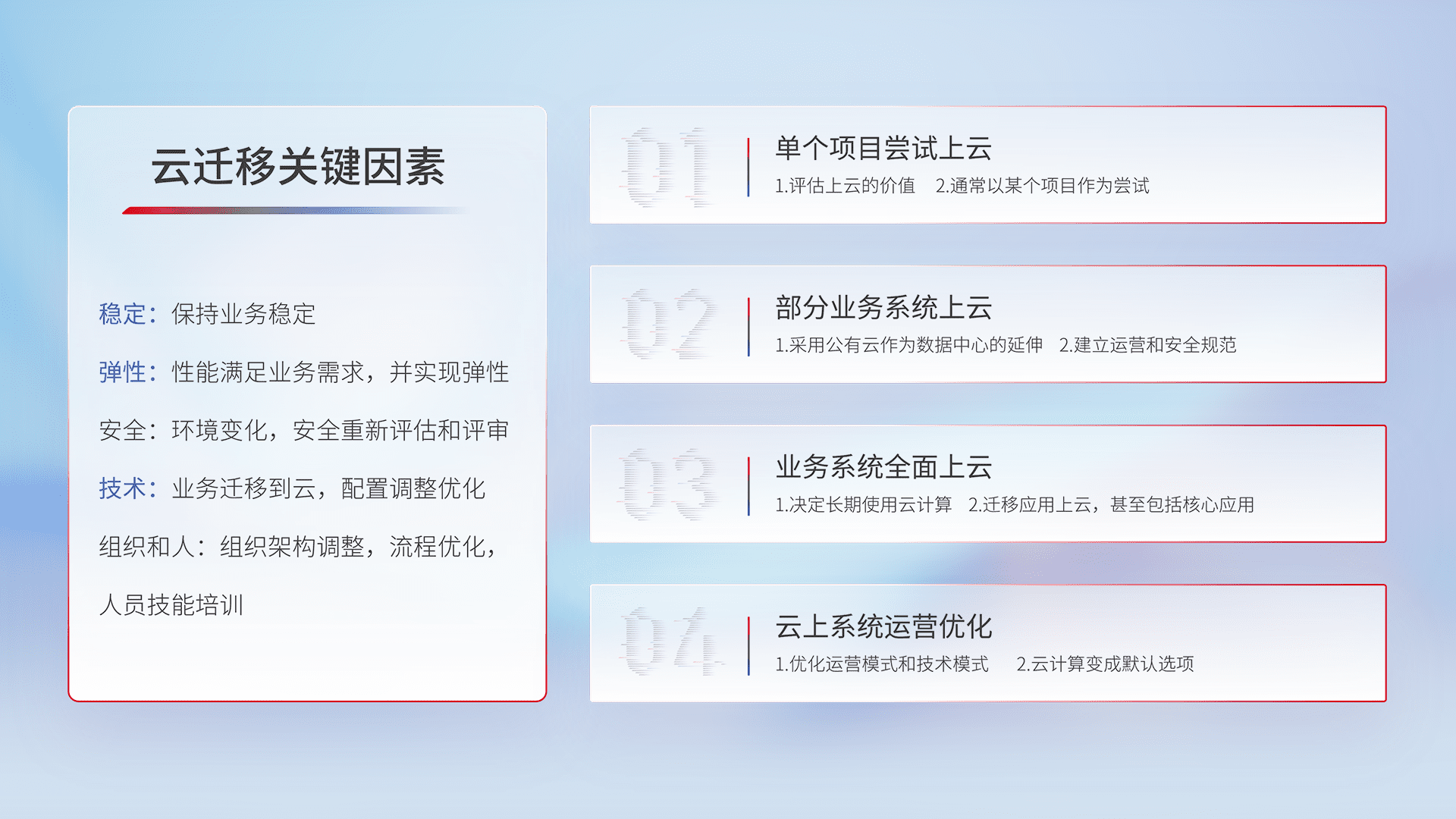 结合实际业务,,从规划设计、、云平台选型、、、、云原生改造、、、数据迁移、、集成交付,,,迁移全过程为客户识别最佳上云路径,,做好风险识别管理,,,设计网络架构、、身份权限、、、、安全审计合规、、、、操作审计、、日志审计、、监控告警策略、、、多站点容灾设计等,,,,对云上基础设施进行整体规划,,,提升IT治理水平,,以满足弹性、、、、高可用、、、高性能的需求。。。