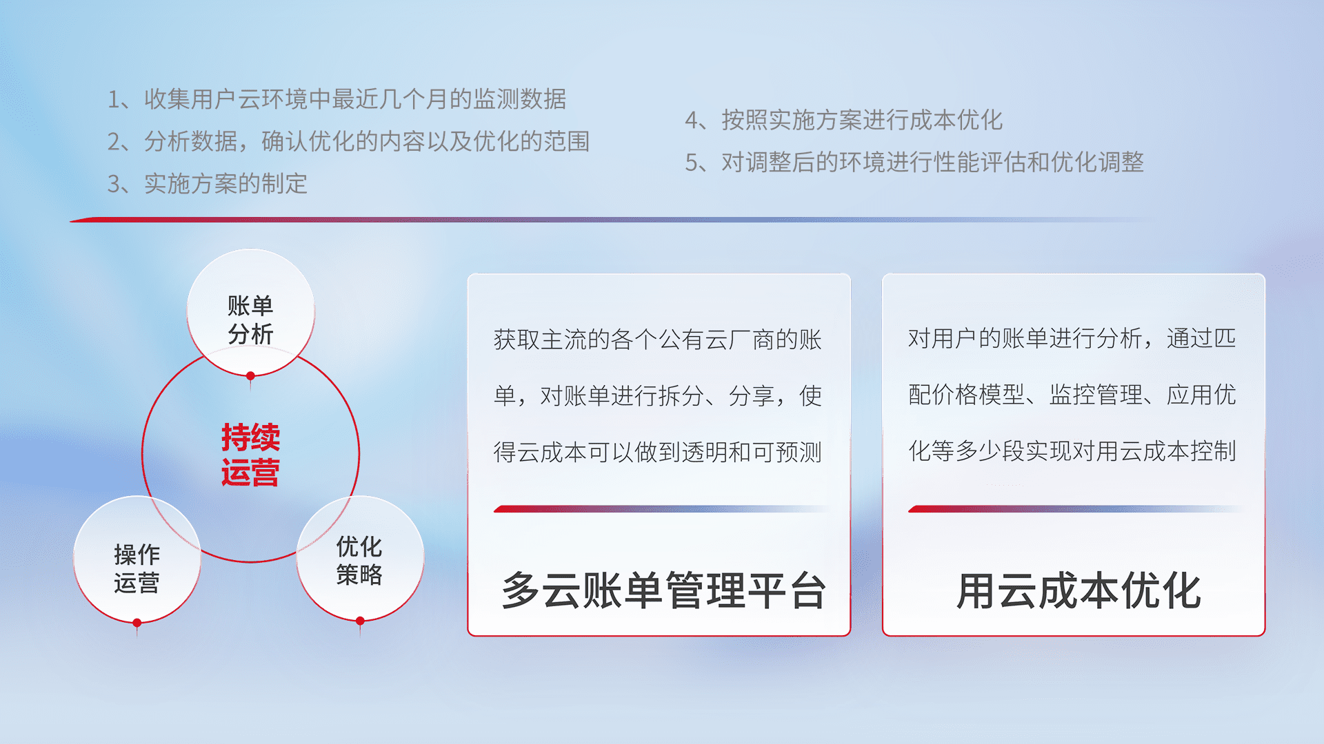 通过多云纳管,,,以统一的资源数据模型把客户的云资源进行抽象和封装,,,进而实现对多云资源的统一操作,,保障云资源管理的可靠性、、、稳定性与可用性。。。量身定制化运维内容,,,,配置、、开发运维、、、补丁管理、、备份、、、、监控、、认证和访问管理、、、审计和日常巡检等,,保障在用云过程中的可靠度,,稳定度以及高可用率。。。。